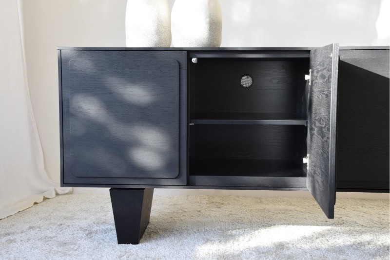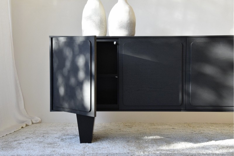 Fabricado en DM rechapado en roble natural en negro mate, cuenta con 4 puertas con sistema push de apertura y estantes interiores.