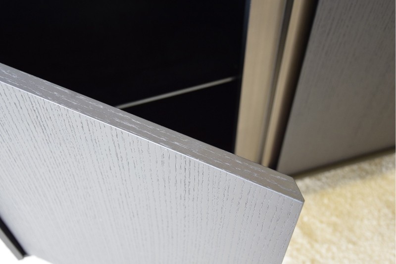 Realizado en DM rechapado en roble natural tenido en negro de acabado mate.