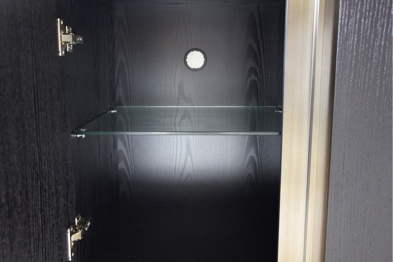 Fabricado en DM rechapado en roble natural en negro mate con detalles en acero y acabado latón en tiradores y patas, cuenta con 4 puertas y estantes interiores de vidrio templado.