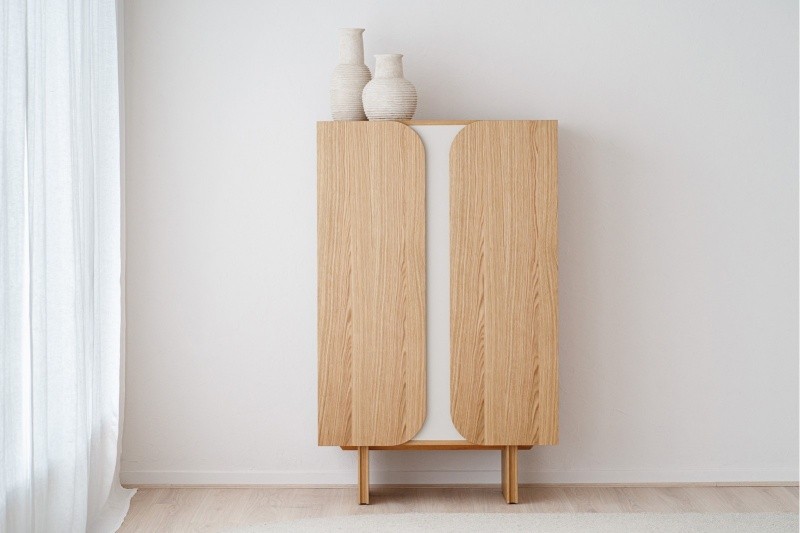 El armario Balarés de Sebastian Suite ha sido elaborado en tablero de DM rechapado roble y acabado natural, con detalle en tono gris arena mate.