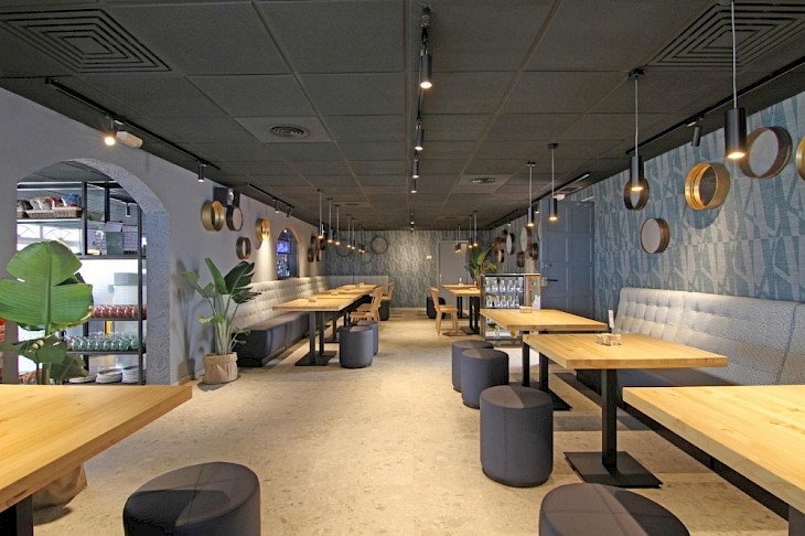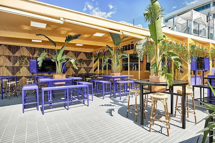 Es uno de los lugares con más colorido de Ibiza. El estudio Masquespacio mezcla madera y azulejo junto con sus tres colores protagonistas: el morado, el verde turquesa y el amarillo mostaza dotando al Töro Bar de una gran personalidad. Con un concepto de sports bar y tapeo español está dirigido al turismo más internacional de la isla. Situado en el último punto de San Antonio cuenta con una gran terraza al borde del mar que se ha convertido en la gran protagonista de todo el espacio. Si quieres disfrutar de los partidos de tus deportes favoritos mientras disfrutas de un buen bocadillo y una cerveza el Töro Bar se convertirá en tu espacio favorito en Ibiza.