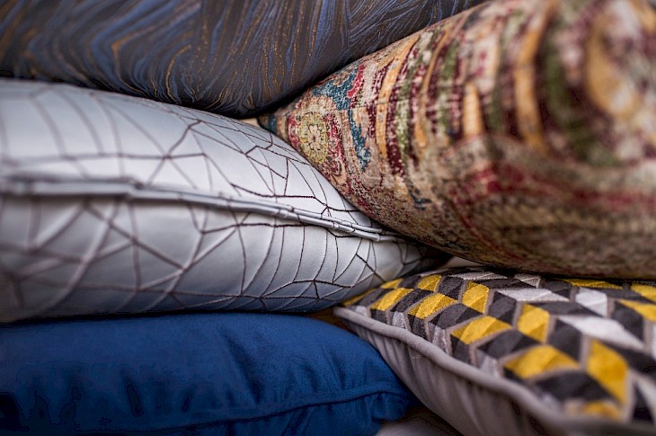 Para ello se han provisto de tejidos cuidadosamente seleccionados, como terciopelos con look de algodón que influyen gran sensualidad o también de estampados de cashmere o de jacquard con efecto desdibujado. Las tonalidades van desde el azul muy intenso, al gris perla o el verde oscuro, pasando por el amarillo más sólido. Predominan las formas rectangulares, si bien también las cuadradas o el formato “petit pain” que se inspira en las Boulangeries provenzales.