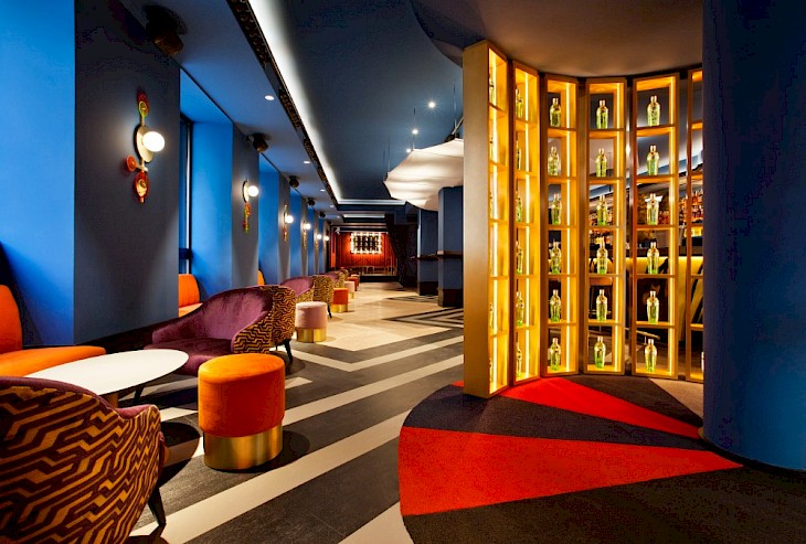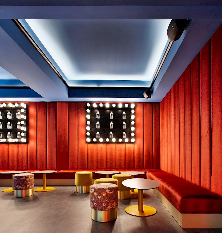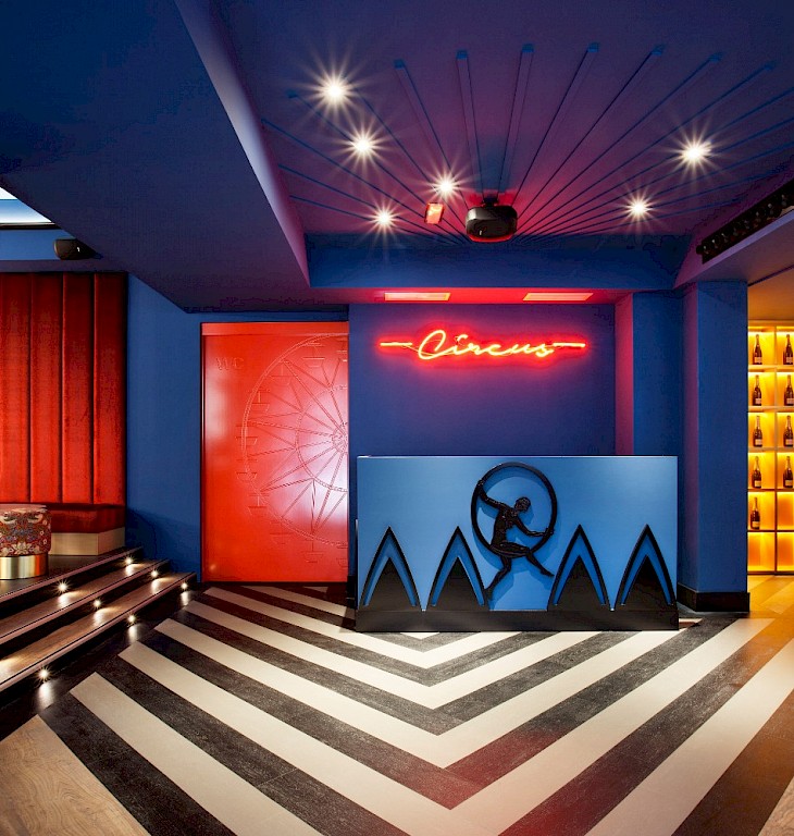 A partir de ahí diseñamos un proyecto 360º, un proyecto de diseño 360º en el que la decoración del local refuerza la imagen de marca a través del mobiliario, la iluminación y los elementos decorativos todos ellos diseñados a medida y haciendo referencia a la temática de los Circos clásicos y al Art Deco. El resultado es un espacio colorista y lúdico pero a la vez muy elegante y sofisticado.