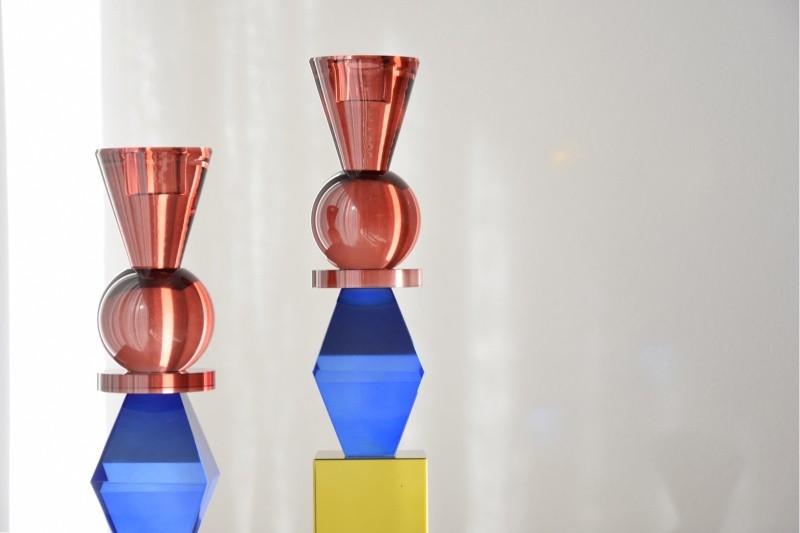 Set 2 candelabros fabricados en cristal de tres colores: amarillo, azul y rojo