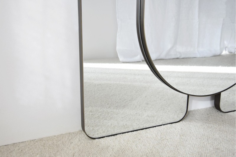 El espejo de suelo Sálamo presenta un diseño singular y lleno de carácter. Su composición combina una pieza central ovalada en primer plano, enmarcada en metal con acabado envejecido, con dos espejos laterales rectangulares de esquinas suavemente redondeadas situados en un segundo plano.