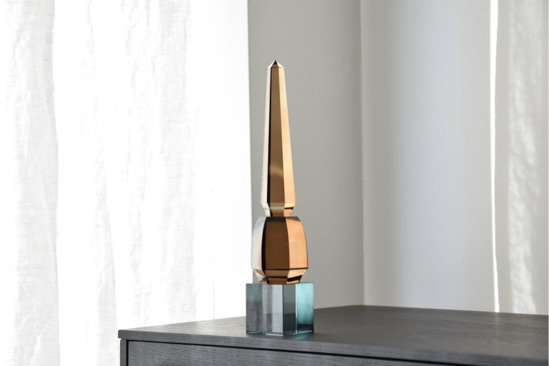 Realizada en cristal pulido ocre con base azul verdoso en forma de obelisco.