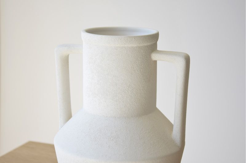 Con asas, en cerámica color blanco roto y aplicación de acabado con textura rugosa.