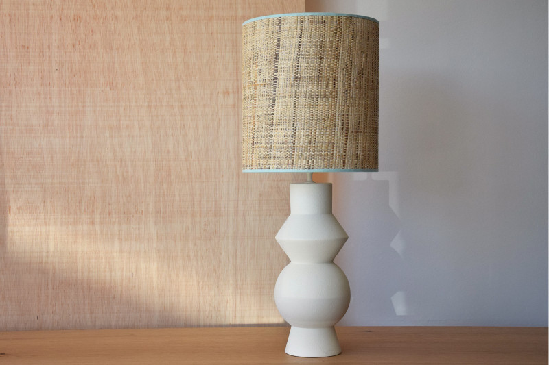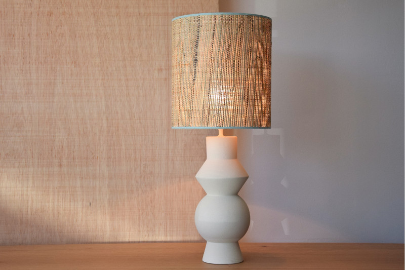 La pantalla cilíndrica, confeccionada en rafia natural, añade suavidad y calidez a la pieza. El vivo superior e inferior en color verde liquen crean un contraste muy suave, enmarcando la pantalla y lo hacen muy fácilmente combinable con otros elementos textiles.