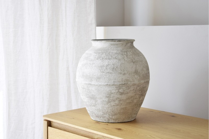 Su volumen se resalta mediante líneas en textura en la parte central, lo que aporta un toque refinado al diseño. El acabado irregular en diferentes tonalidades de blanco y gris, junto con una pátina aplicada de manera superficial, otorgan a esta pieza un carácter envejecido y con historia.