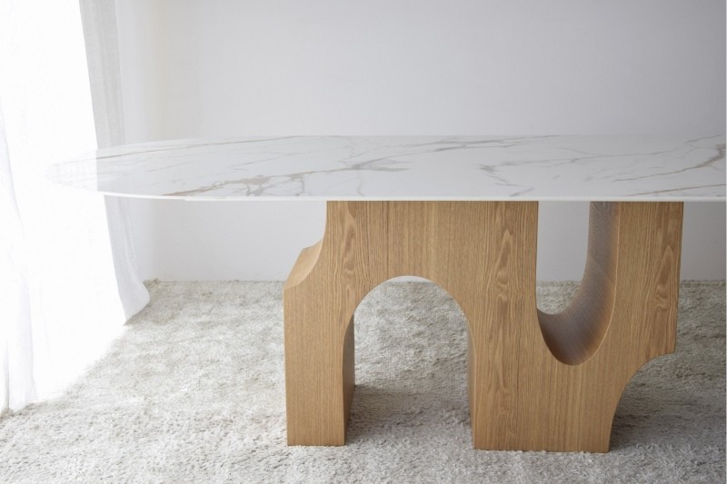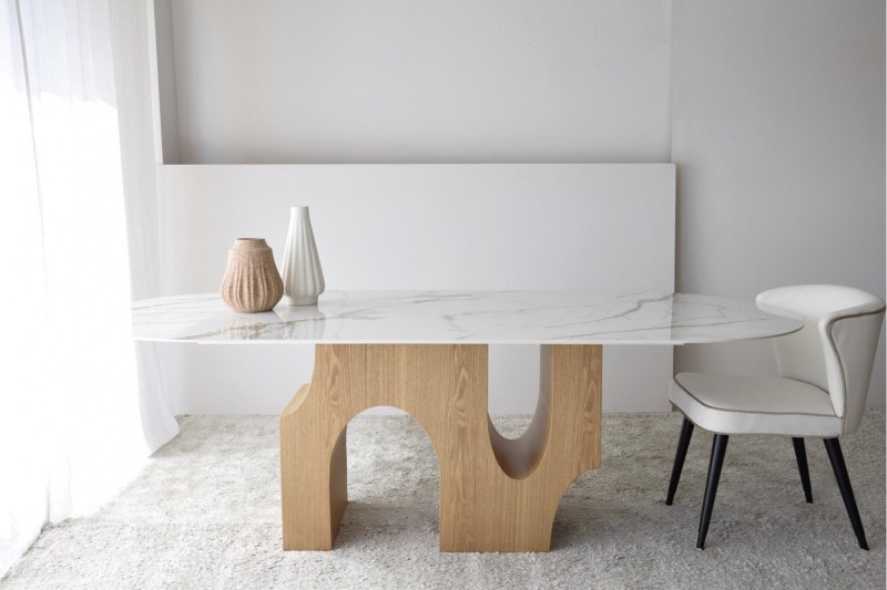 La mesa de comedor Beford con un sobre de cerámica de 12 mm de espesor, presenta un estético acabado en mármol blanco con vetas en tonos ocres y grises, que aporta elegancia y sofisticación al espacio.