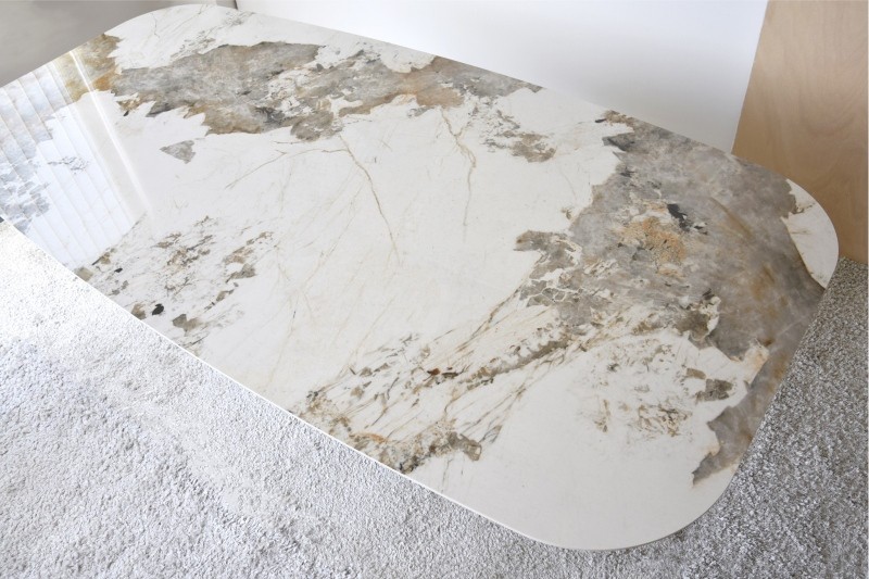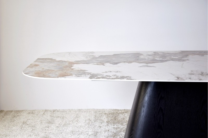 La mesa de comedor Stanton con un sobre de piedra sinterizada de 12 mm de espesor, presenta un estético acabado en con vetas en tonos grises y pétreos, que aporta elegancia y sofisticación al espacio.