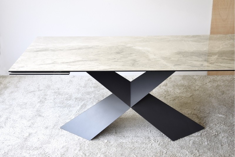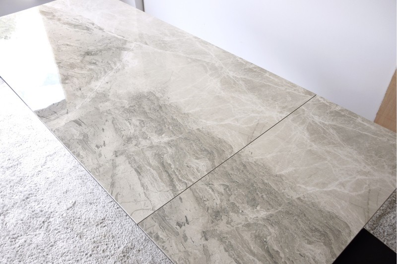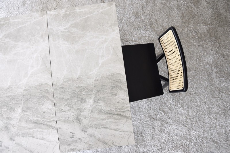 Mesa de comedor Astall extensible con un sobre en material cerámico de acabado mármol gris, con vetas en blanco y diferentes gamas de grises que evocan la belleza de los materiales naturales, convirtiendo su superficie en una pieza decorativa única.