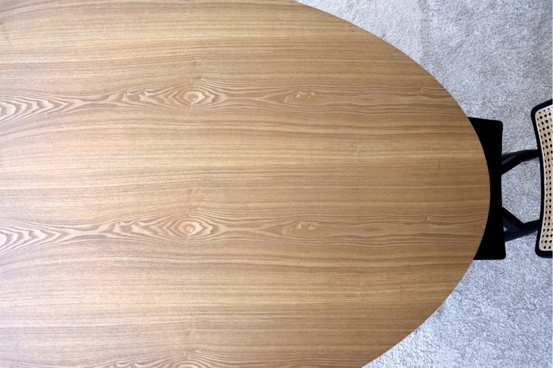 La mesa de comedor Norton, con tablero ovalado y base central que sigue la misma estética curva, aporta una sensación de armonía y fluidez.