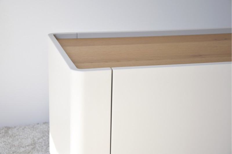 Fabricado en DM lacado en tono gris arena con acabado mate, se combina con una parte superior rechapada en madera de roble natural, lo que le aporta una extraordinario calidez.