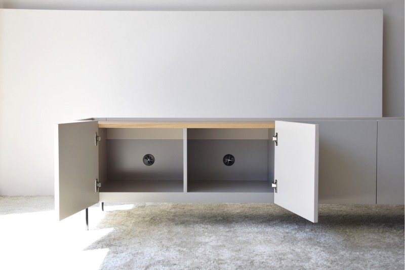 Realizado en DM lacado en tono gris arena con parte superior en roble natural.