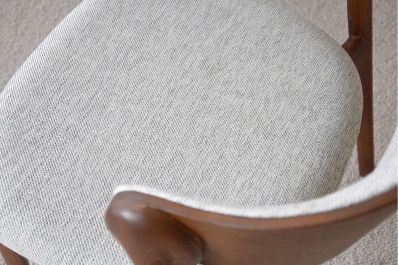 Su asiento y respaldo están tapizados en mezclilla blanco gris, lo que favorece su incorporación en múltiples espacios debido a su versatilidad y confort.
