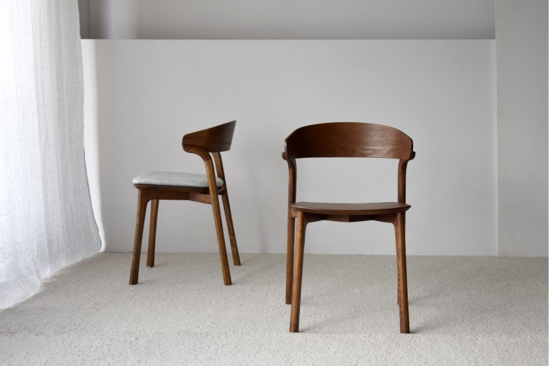 Realizadas en madera maciza de fresno, en color castaño, con tapicería en gris.