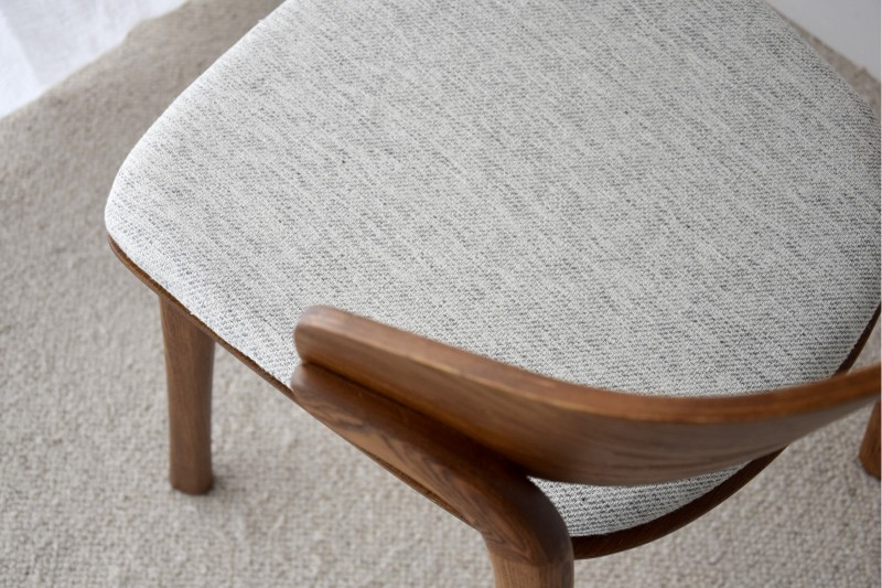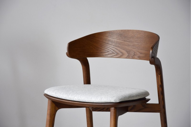 Tanto el asiento como el respaldo están elaborados en tablero contrachapado de fresno, resaltando las elegantes vetas naturales de la madera.