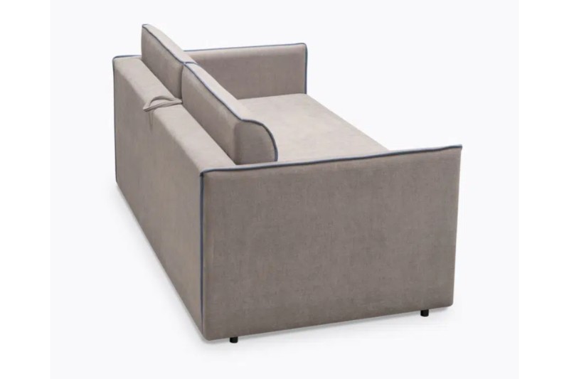 Se trata de una pieza elaborada en madera de pino y aglomerado de partículas con refuerzo. La suspensión de asiento de sofá con cincha elástica de 60/80 mm cuenta con un mecanismo sin suspensión. El revestimiento de tejido sin tejer, espuma PUR 20 kg/m3 y fibra de poliéster FR 200 g/m2 de otorgan un extra de confort.